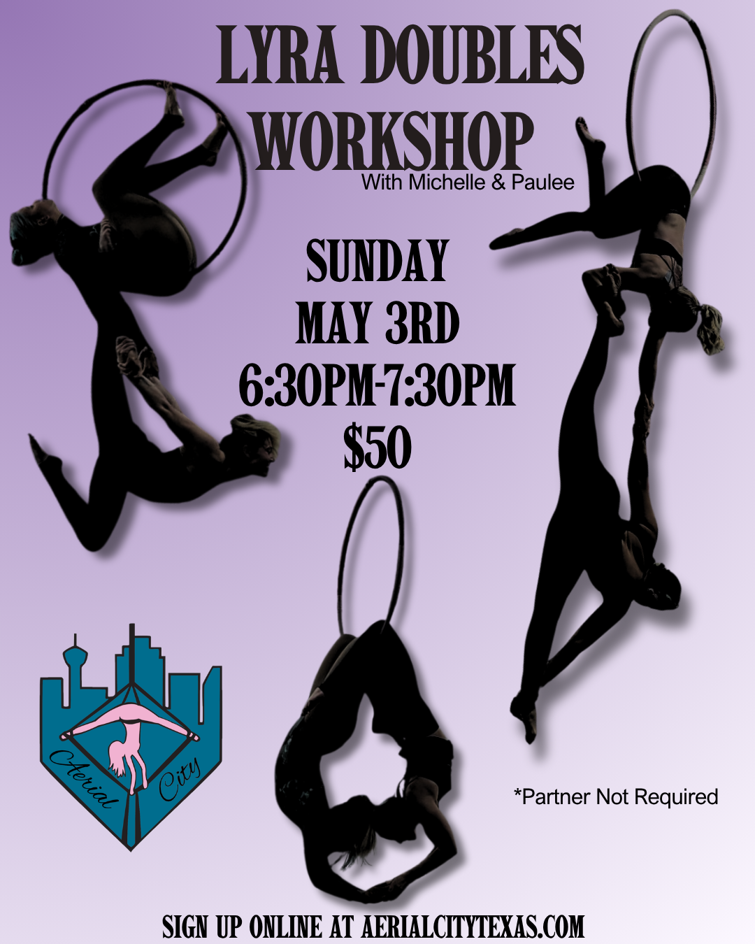 Lyra Doubles Workshop Let's take Aerial to the next level with Lyra Doubles. Here we will explore shapes and techniques on how to maneuver with another person. Partner is not required but is encouraged. Must have completed intro level or have basic knowledge of lyra.
