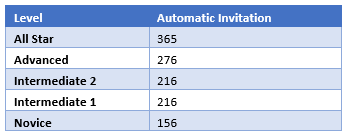 Performers scoring a minimum of points in their level listed below are automatically invited to register for Nationals. See Appendix E in the Competitor Packet for details.